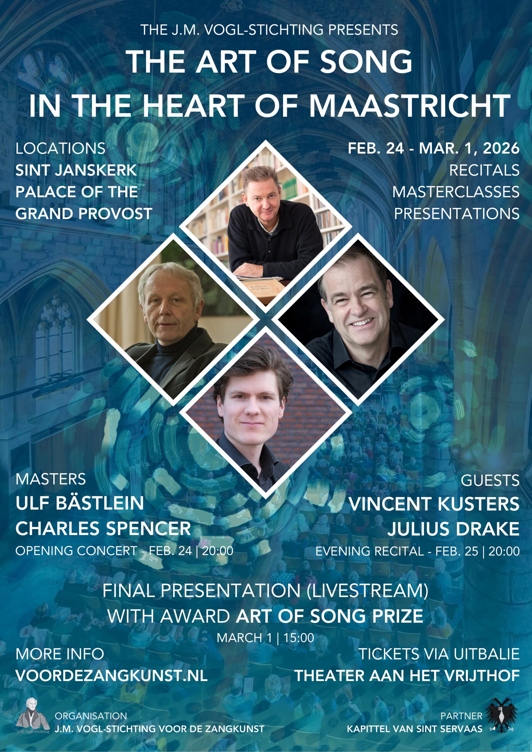 Een drietal concerten en een Masterclass liedinterpretatie voor Lied duo’s, onder leiding van de vooraanstaande masters Ulf Bästlein en Charles Spencer. Aan het eind van de week gaat één van de duo’s, geselecteerd door een vakjury, met de felbegeerde Maastricht Art of Song Prize naar huis: €2.500,- én een betaald optreden in 2027. Bij een van de recitals treedt Vincent Kusters op samen met sterpianist Julius Drake.